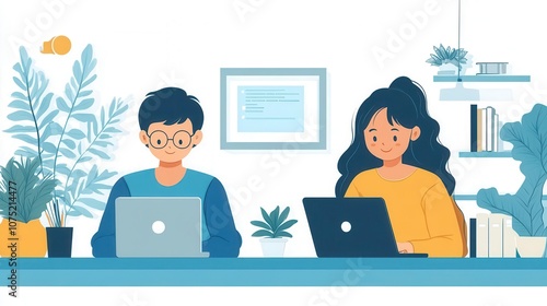 team of two professional colleagues collaborating on a laptop, showcasing a positive work dynamic in a modern office setting, emphasizing teamwork and innovation