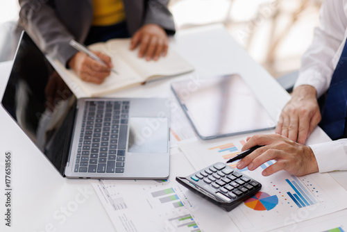 Team og Business work on calculator and laptop for do math finance on wooden desk in office and business working background, tax, accounting, statistics and analytical research concept