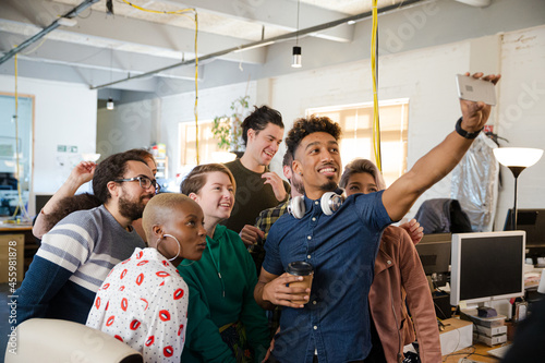 Team taking group selfie in office