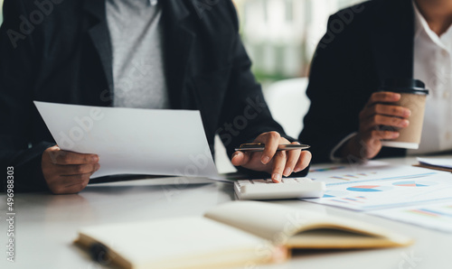 Team work process. young business managers crew working with new startup project. labtop on white table, texting message, analyze graph plans.