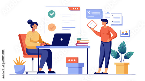teamwork, collaboration, productivity, office, work, business, meeting, planning, strategy, task, checklist, laptop, computer, desk, woman, man, people, illustration, vector, modern, creative, learning, education, online, digital, communication, organisation, efficiency, success, goal, progress, document, note, book, plant, indoor plant, home office, startup, entrepreneurship, datum, concept