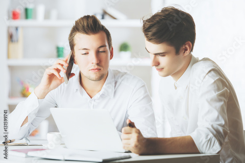 business, people, portrait, white, office, adult, caucasian, young, businessman, professional, corporate, teamwork, background, man, partnership, european, working, executive, photogenic, attractive, businessperson, looking, thinking, focused, workplace, talking, phone, conversation, communication, technology, device, electronic, smartphone, mobile phone, cellular, mobile, smart, desk, sitting, project, laptop, paperwork, accounting, doing, document, discussing, hot drink, online, education, student