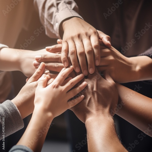 Teamwork, empathy,partnership and Social connection in business join hand together concept.Hand of diverse people connecting. generative ai