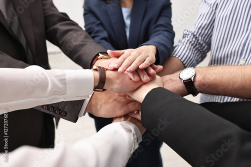Teamwork. Group of people joining hands together indoors, closeup