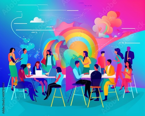 company, business, teammate, team, teamwork, negotiate, canvasses, datum, chart, collaboration, vibrantly, background, bright, atmosphere, yellow, orange, red, purple, pink, magenta, blue, green, rainbow, high-coloured, colourful, white, sky, cloud, people, man, woman, employee, applying, work, job, labor, worked, office, analysis, plan, project, table, diagram, statement, computer, laptop, visualisation, graph, illustration