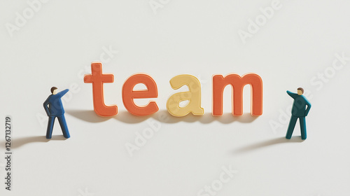 Teamwork Makes the Dream Work: Two miniature figures stand proudly beside the word "team," symbolizing collaboration, unity, and the power of collective effort.