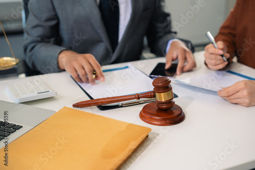 Teamwork of business lawyer meeting working hard about legal legislation in courtroom to help their customer.