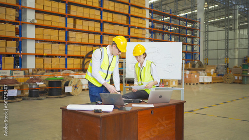 Teamwork of workers working in large warehouse retail store industry.Rack of stock storage. Interior of cargo in ecommerce and logistic concept. Depot. People lifestyle. Shipment service for container