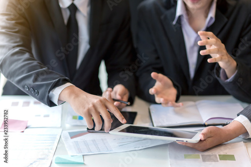 Teamwork process, business people working in the office discussing documents and ideas at meeting