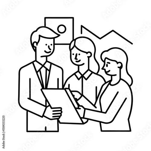 Teamwork scene with team members checking quality control list in business environment vector line art on white background