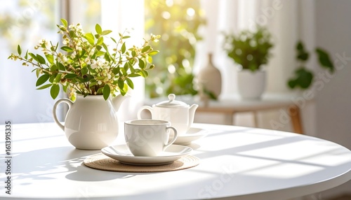 teapot, cup, tableware, flower, floral arrangement, indoor, still life, table setting, decoration, home decor, minimalist, white, ceramic, kitchen utensile, bright, sunny, daylight, shadow, peaceful, calm, fresh, elegant, simple, clean, modern, stylish, plant, leaf, sunlight, window, table, cosy, minimal, pastel, background, artistic, creative, design, decorative, botanical