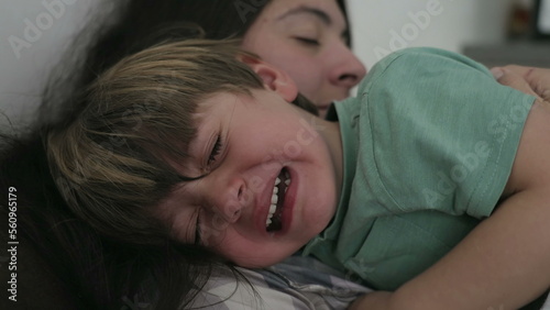 Tearful crying child. Mother consoling sad little boy. Kid in crisis cries