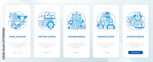 Tech startup financing options blue onboarding mobile app screen. IT walkthrough 5 steps editable graphic instructions with linear concepts. UI, UX, GUI template. Myriad Pro-Bold, Regular fonts used