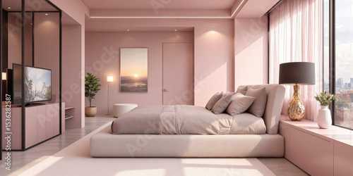 Tech-integrated bedroom in dusty rose, featuring voice-activated furniture that automatically adjusts to personal preferences, such as beds that elevate
