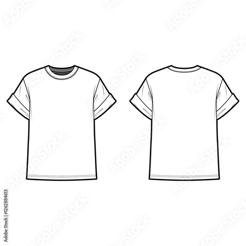 Technical flat sketch of Roll-up short sleeve T-shirt Round neck top in jersey. Vector mock up Template.