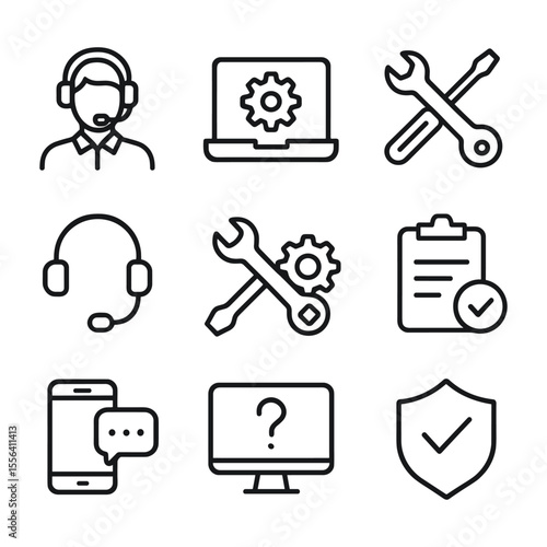 icon, technical, line, support, help, service, client, assistance, repair, maintenance, computer, technology, communication, phone, chat, electronic mail, troubleshooting, solution, fix, tool, wrench, gear, setting, desktop, laptop, server, vector, signs, symbol, outline, black, linear, network, wi-fi, headset, call, contact, agent, operator, help desk, ticket, resolution, expert, professional, information technology, system, software