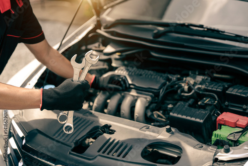 Technician auto mechanic holding wrench for fix service repairing change spare part engine problem or insurance support or range of car check or training workshop and car care maintenance servicing.