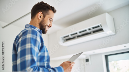 air, conditioning, technician, smart, technology, installation, modern, home, cooling, professional, tablet, setup, innovation, system, repair, maintenance, interior, device, service, engineering, equipment, comfort, white, clean, climate, futuristic, workspace, wall-mounted, operation, worked, expertise, efficiency, digital, tool, precision, residential, control panel, automation