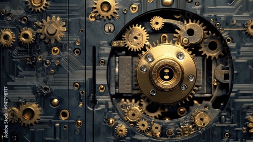 hybrid, lock, technology, mechanical, gear, digital, circuit, futuristic, security, innovation, combination, advanced, intricate, design, concept, robotic, machine, future, engineering, interconnected, cyber, keyhole, complex, abstract, metal, electronic, artificial, intelligence