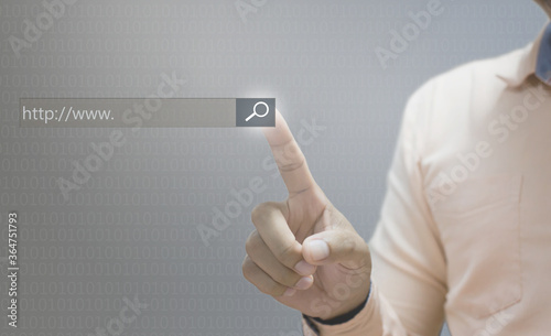 Technology searching system and internet concept man hand pressing Search button