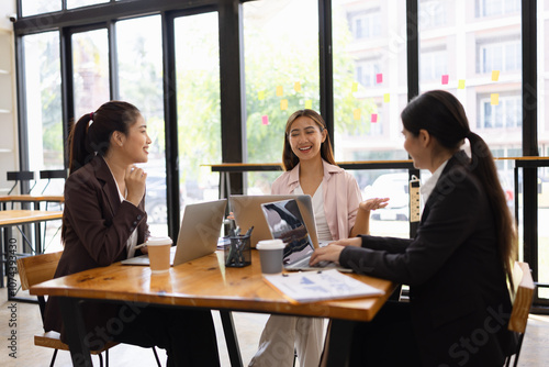 Technology and financial advisory services concept. Businesswoman teamwork and working on digital laptop computer with advisor showing plan of investment to clients at table office. Digital marketing.