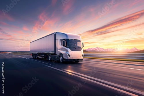 Technology Digital Future of Cargo Container Logistics Transport Concept, Container Freight Truck, Modern futuristic Import Export Transportation Background. Front view, summer morning or evening