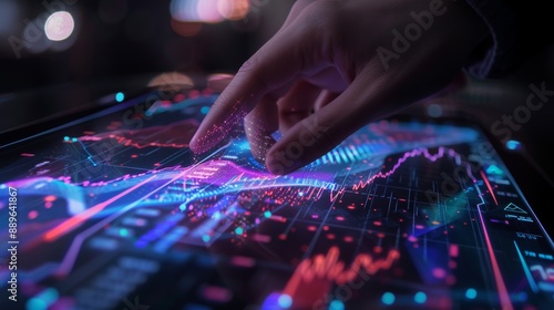 TechSavvy Finance Hand Interacting with Holographic Stock Market Data on Transparent Screen Innovative Financial Analysis Concept