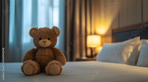 Teddy Bear on Hotel Bed at Night Soft Lighting