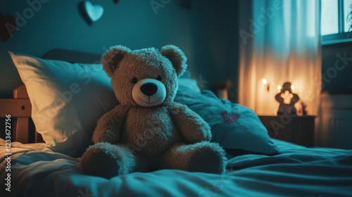 teddy, bear, stuffed, toy, plush, bedchamber, bed, night, dark, room, sleep, comfort, childhood, nostalgia, cosy, soft, fur, brown, pillow, blanket, sheet, teal, blue, light, glow, calm, peaceful, quiet, serene, gentle, sweet, dream, innocence, love, nubes, romantic, shadow, warmth, cuddly, friends, alone, window, curtain