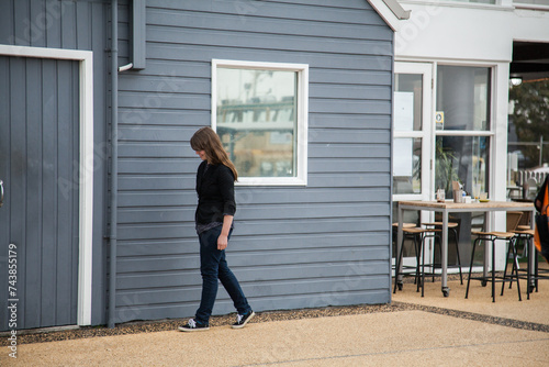 teenage, girl, walking, harbor, building, newcastle, overcast, day, blue, young, outdoors, caucasian, female, single, outside, teenage, street, building, winter, urban, weatherboard, shop