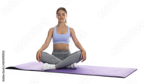 Teenage girl in sportswear stretching on mat against white background