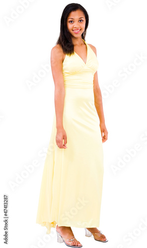teenage, girl, smiling, lifestyle, beauty, isolated, white, content, happiness, happy, standing, toothy, smile, adolescence, african american, cut-out, dress, fashion, person, 1, portrait, pose, posing, sandal, teenage, yellow