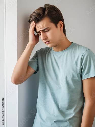 Teenage guy with headache, intoxication and other symptoms of hangover standing by wall in domestic room and touching head