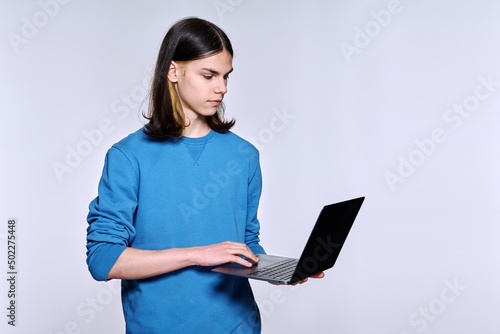 Teenage male student using laptop, light studio background