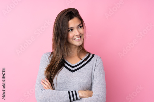 girl, woman, woman, people, person, female, studio, teenage, teenage, youth, young, caucasian, brazilian, isolated, colours, colourful, background, wall, pink, lateral, looking, head, face, portrait, look, concept, side, happy, funny, laughing, smile, happiness, expression, gesture, good, positive, arm, cross