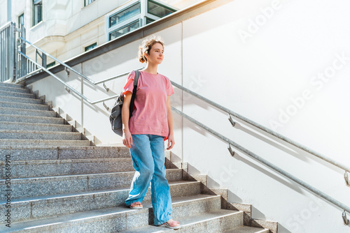 teenager girl, student of gymnasium, with backpack, steps down stairs in rays of sun. Positive emotions, young teenager girl, happy youth. Goes to meet happiness, airport building, university steps