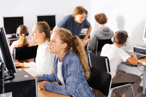Teenager girls and boys studying in computer lab during lesson.