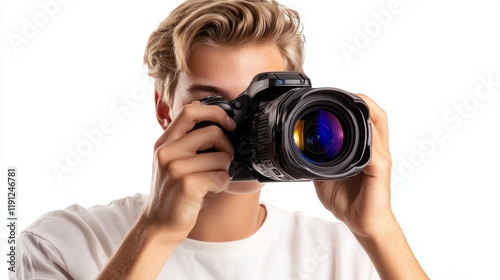 teenage, male, holding, camera, posing, photo, portrait, studio, lifestyle, expression, young, equipment, action, isolated, closeup, sharpened, creativity, leisure, youth, modern, trendy, casual attire, white, attractive, natural, confident, smiling, cheerful, hobby, fun, editorial, concept, candid, eye contact, bright, innovation, skill, enthusiastic, activity, stylish, fashion, passion, personal, technique, visual, playfulness, inspiration