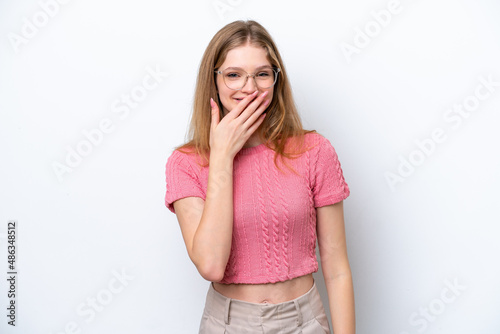 Teenager Russian girl isolated on white background happy and smiling covering mouth with hand