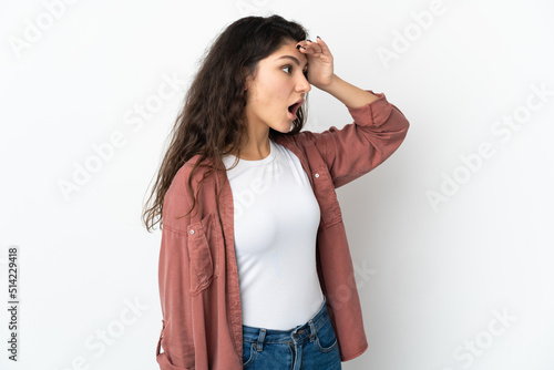 Teenager Russian girl isolated on white background with surprise expression while looking side
