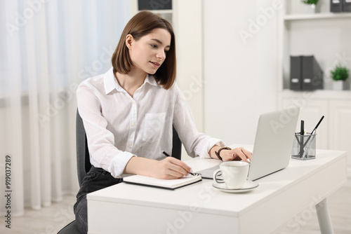 Teenager taking notes while working with laptop at home. Remote job