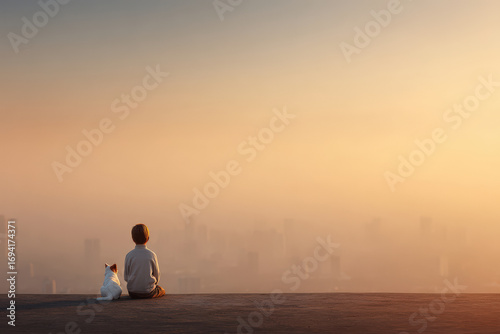 teenager with dog sits on rooftop in early morning enjoying warm sunlight and fresh air