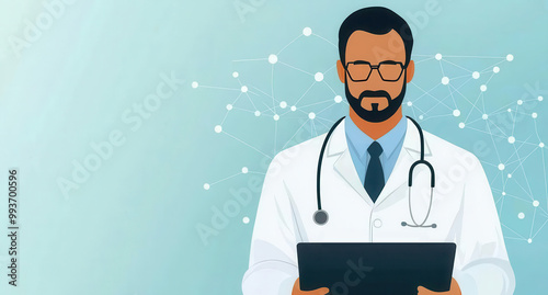 Telemedicine consultation between doctor and patient, futuristic interface showing interconnected healthcare services, global care network,