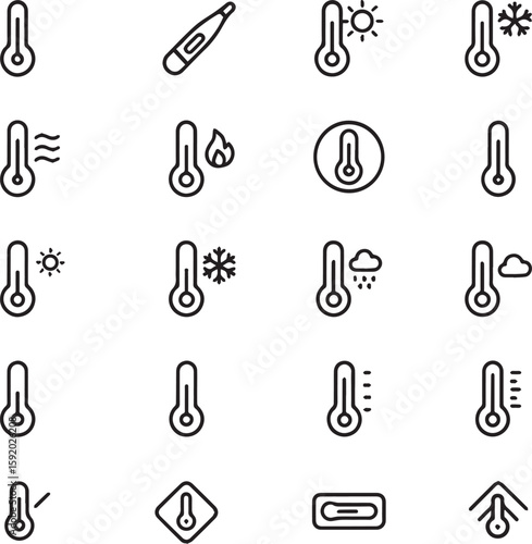 Temperature and thermometer icon set. 20 climate and weather line symbols. Temperature icon set vector.