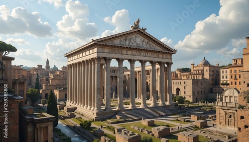 Temple of Castor and Pollux in the Roman Forum, a breathtaking ancient Roman temple with detailed architecture and surrounding ruins under a partly cloudy sky