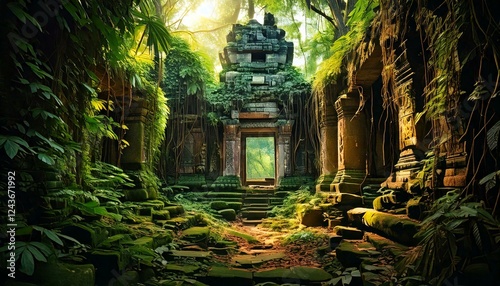 temple ruins covered in jungle vines