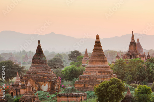 Temples at sunset from Shwesandaw Pagoda in Bagan, Myanmar; Bagan, Myanmar