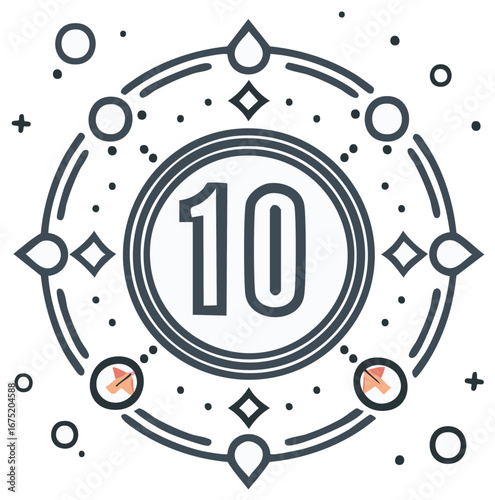 ten, 10, badge, logotype, number, circle, diamond, shape, dripped, waterdrop, arrow, arrow, decorative, decor, graphic, simple, clean, dot, dot, cross, celebration, event, anniversary, milestone, achievement, icon, symbol, design, element, tenth, numeral, round, outline