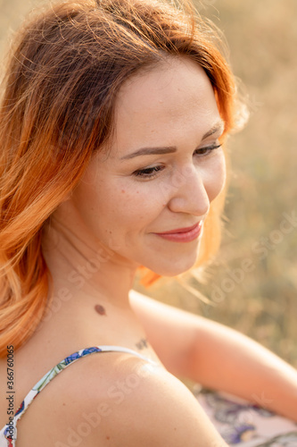 Tender beautiful red-haired girl enjoys the sunset in a field with a hill.