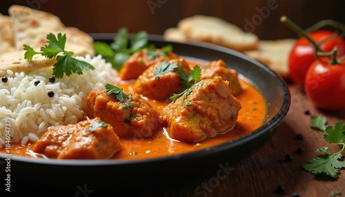 Tender chicken tikka masala served with basmati rice and naan bread. Rich creamy tomato sauce with spices and herbs. Delicious indian cuisine for lunch or dinner.